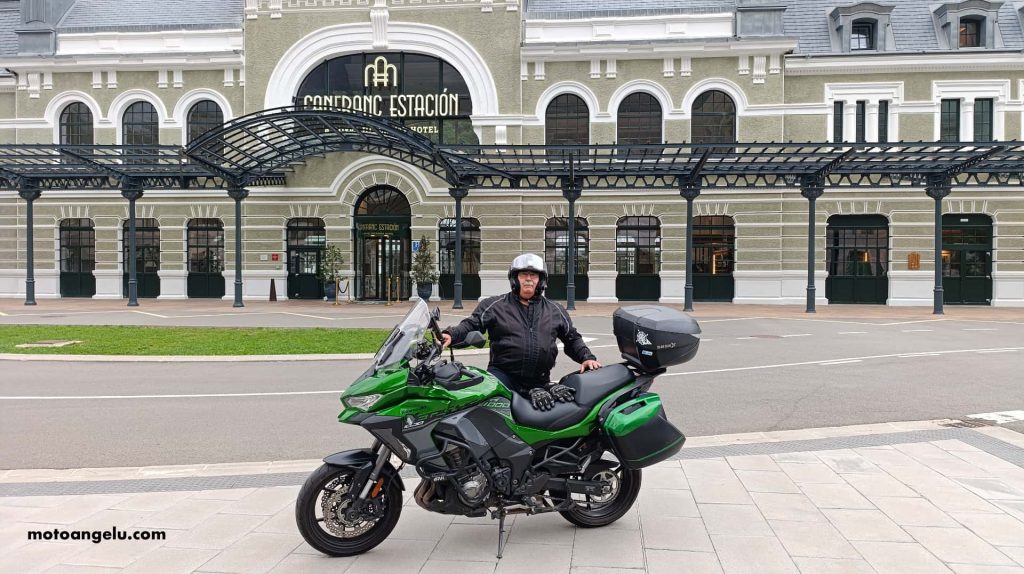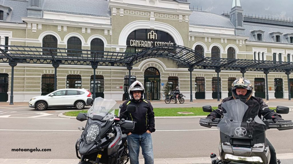 Sí pudimos acceder con las motos hasta la estación, aunque la carretera hacia el norte estaba cortada. Nos hicimos las fotos de rigor frente a aquella imponente fachada, hoy reconvertida en hotel, pero no entramos: el tiempo mandaba. Tras unos minutos, regresamos de nuevo hacia Jaca para encarar la etapa definitiva.