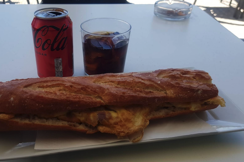 A las diez y media apareció el Bar Restaurante El Portal del Pirineo, junto a la carretera. Era el momento perfecto para almorzar: un bocadillo de tortilla espectacular y las bebidas necesarias para reponer fuerzas. Fue un alto sencillo pero agradecido. Para mí, además, significó otro calmante: la espalda seguía recordándome su presencia.