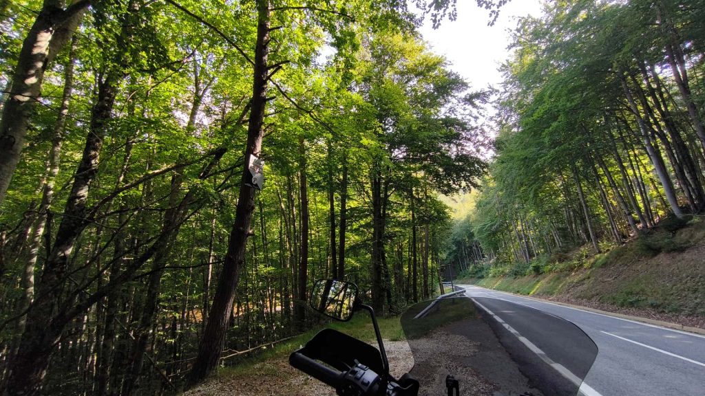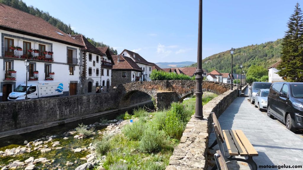 Seguimos por la NA-140, uno de los tramos más frondosos de todo el viaje. Curvas, árboles, humedad y un aire de naturaleza salvaje nos envolvían por completo. Fue un placer para las motos, aunque durante varios kilómetros un enorme camión delante nos obligó a contener el ritmo y nos robó parte del disfrute. Con la espalda ya molestando más de lo que quería reconocer, tampoco me sentía con la destreza suficiente para arriesgar un adelantamiento. Aun así, el valle mereció la pena.