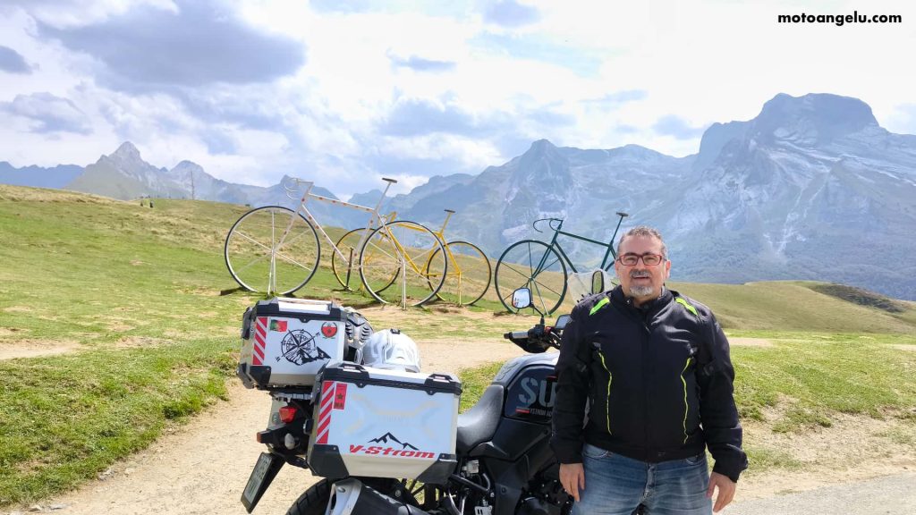 La carretera nos llevó entonces hasta el Col d’Aubisque (1 709 m). El ascenso volvió a regalarnos paisajes impresionantes, y en la cima nos esperaba su símbolo más reconocible: las enormes bicicletas de colores, foto obligada para todo el que pasa por allí. Otro hito que añadíamos al día.