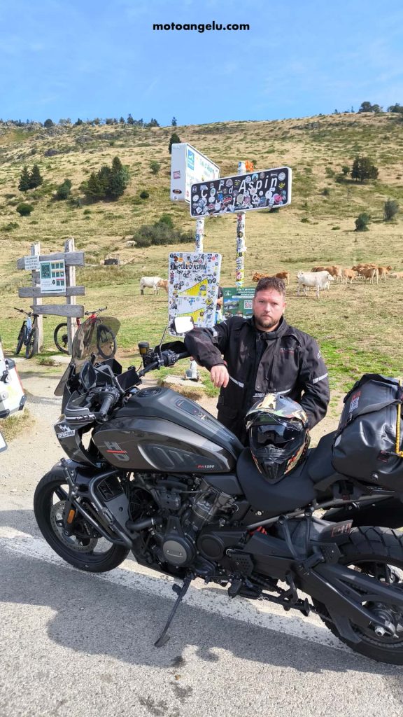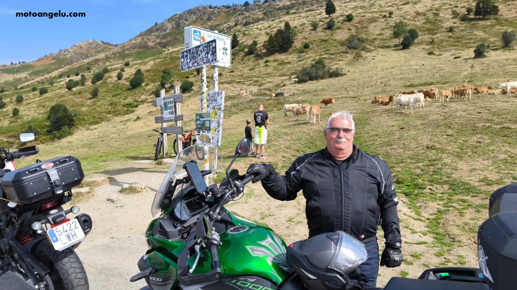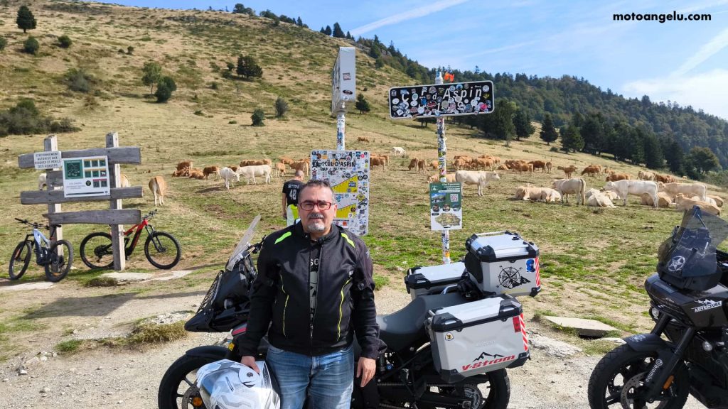 Con energías renovadas encaramos el Col d’Aspin (1 489 m). En la cima, la escena era auténtica: ciclistas y turistas haciéndose la foto de recuerdo junto al cartel del puerto, mientras las vacas pastaban a su aire alrededor. La montaña se compartía entre todos, y ese contraste le daba un encanto especial al lugar.
